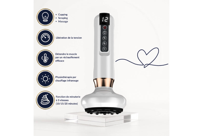 10 min en ventouse, 5 min en scraping, selon la zone. Le minuteur intégré évite toute surutilisation.
